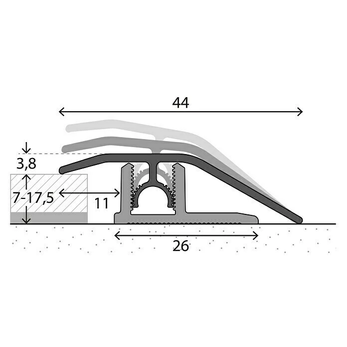 Das LOGOCLIC Anpassprofil ist für Bodenbelagstärken von 7 – 17,5 mm konstruiert. Verdeckt befestigt bietet es eine perfekte Optik ohne Schraublöcher. Die flache Oberfläche ohne Zierrillen sorgt für zeitlose Eleganz. Die Montage ist besonders schnell und einfach. Zunächst wird das Basisprofil mit Montage- oder einem Zwei-Komponenten-Kleber auf dem Untergrund verklebt. Alternativ kann das Basisprofil auch verschraubt werden. Mit dem bogenverzahnten Gelenksteg rastet das Oberprofil im Basisprofil ein und passt sich automatisch dem Bodenbelag an – variabel in Höhe und Neigung. Auch bei stärkeren Niveauunterschieden liegt das Profil an beiden Seiten dicht an. Gleichzeitig erlaubt die Bogenverzahnung die problemlose Demontage. Das Oberprofil kann bei Bedarf gelöst und anschließend wieder im Basisprofil verankert werden. Die Profile wurden vom deutschen TÜV auf eine Punktbelastbarkeit von 1,5 Tonnen getestet. Hinweis: Passender Klebstoff oder Montagematerial ist separat zu erwerben.