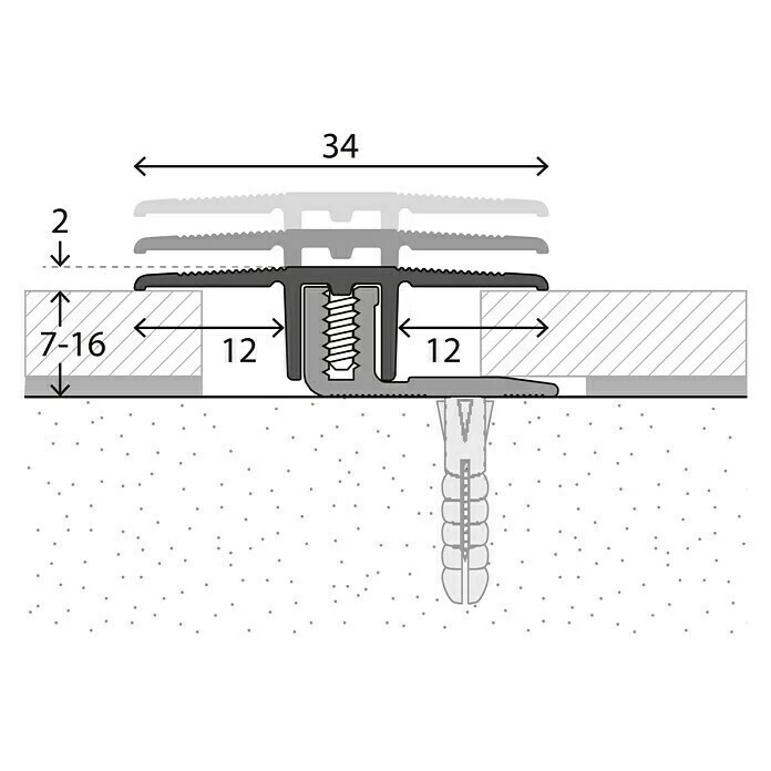 Das LOGOCLIC Übergangsprofil ist für die Verarbeitung von Laminat und Parkett mit Belagstärken von 7 – 16 mm konstruiert. Das bewährte Schraubprofilsystem ist schnell und einfach zu verarbeiten. Zunächst wird das Basisprofil auf dem Untergrund verschraubt und der Boden verlegt. Danach wird das Oberprofil aufgelegt. Die beiden Stege greifen über den Schraubkanal des Basisprofils, mit den beigefügten Schrauben wird es im Schraubkanal befestigt.