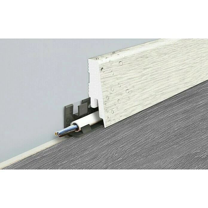 Die LOGOCLIC Sockelleiste K58 C ist eine hochwertige, moderne und geradlinige Abschlussleiste aus Kunststoff für die perfekte Bodengestaltung passend zum jeweiligen Element Hartvinylboden. Die benötigte Dehnungsfuge zur Wand wird optimal überdeckt und das Bodendesign konsequent fortgeführt. Das Ziel ist ein rundum harmonisches Bild bis hin zum Wandabschluss. Separat erhältliche Montageclips garantieren eine einfache Anbringung und lassen eine versteckte Kabelverlegung zu.
