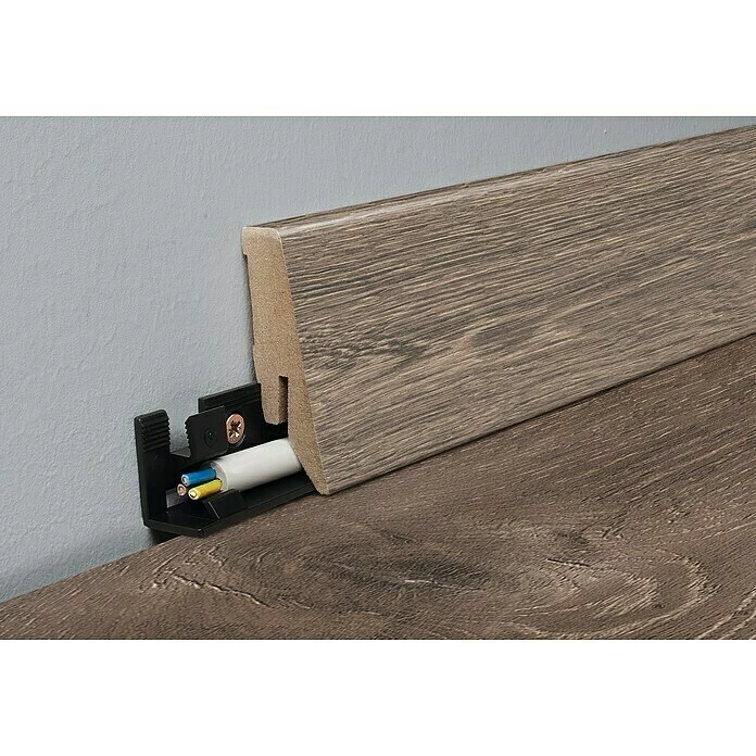 Die MyStyle Sockelleiste verfügt über eine moderne Formgebung. Sie ist 58 mm hoch und überdeckt 19 mm Bodenfläche. Mit den im Lieferumfang enthaltenen einfach zu montierenden Kunststoffclips wird die Leiste unsichtbar an der Wand befestigt. Die Verlegung eines 4-poligen Kabels im Clip ist ebenfalls möglich.