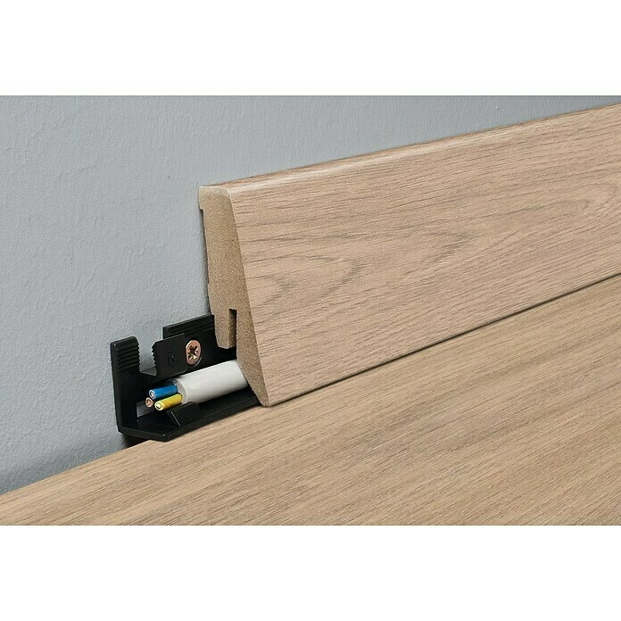 Die MyStyle Sockelleiste verfügt über eine moderne Formgebung. Sie ist 58 mm hoch und überdeckt 19 mm Bodenfläche. Mit den im Lieferumfang enthaltenen einfach zu montierenden Kunststoffclips wird die Leiste unsichtbar an der Wand befestigt. Die Verlegung eines 4-poligen Kabels im Clip ist ebenfalls möglich.
