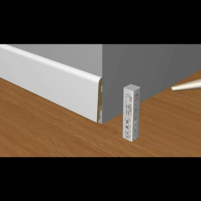Die Eckstäbchen von Profiles and more sind universell als Innen-, Außen- oder Endstücke einsetzbar. Die optisch dezent auffallenden Stäbchen ersparen das mühsame Schneiden von Gehrungen und bieten gleichzeitig Schutz von exponierten Außenecken. Vor der Montage werden die Eckstäbchen in der Höhe an die Sockelleiste angepasst – Höhe der Sockelleiste +2 mm – und schließlich an die Stirnseiten der Leiste geklebt. Zum Befestigen dürfen keine silikonhaltigen Klebstoffe verwendet werden. Geeignet sind Montagekleber auf PUR-Basis oder Kontaktkleber. Bei Verlegung von Kabeln hinter der Sockelleiste wird das Stäbchen einfach an der Rückseite entsprechend ausgeschnitten.