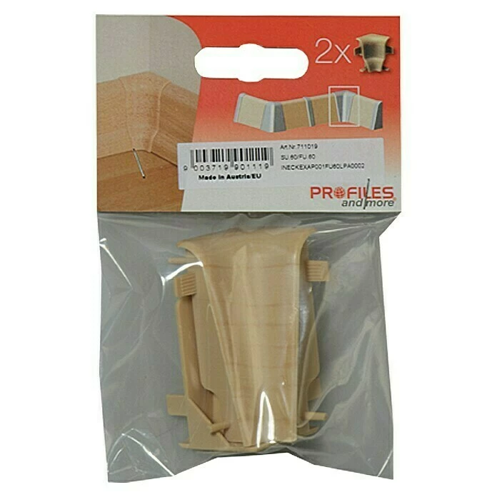 Die Innenecke von Profiles and more besteht aus hochwertigem Kunststoff und erleichtert die Sockelleistenmontage. Die Ecke wird einfach zwischen die Enden der rechtwinkelig geschnittenen Leisten gesteckt. Dadurch ist kein komplizierter Gehrungsschnitt mehr notwendig.