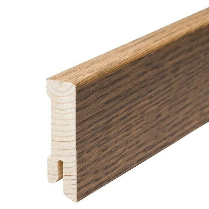 Diese Sockelleiste begeistert mit einem Kern aus Fichtenholz und einer hochwertigen Echtholzfurnier-Oberfläche durch ihre langlebige Qualität. Ihre authentische Optik in Bernsteineiche wird durch Naturlack veredelt und geschützt. Das ansprechende, gerundete Profil fügt sich dezent in jede Raumgestaltung ein. Die unsichtbare Montage der Sockelleiste wird durch ihre Clip-Nut erleichtert.